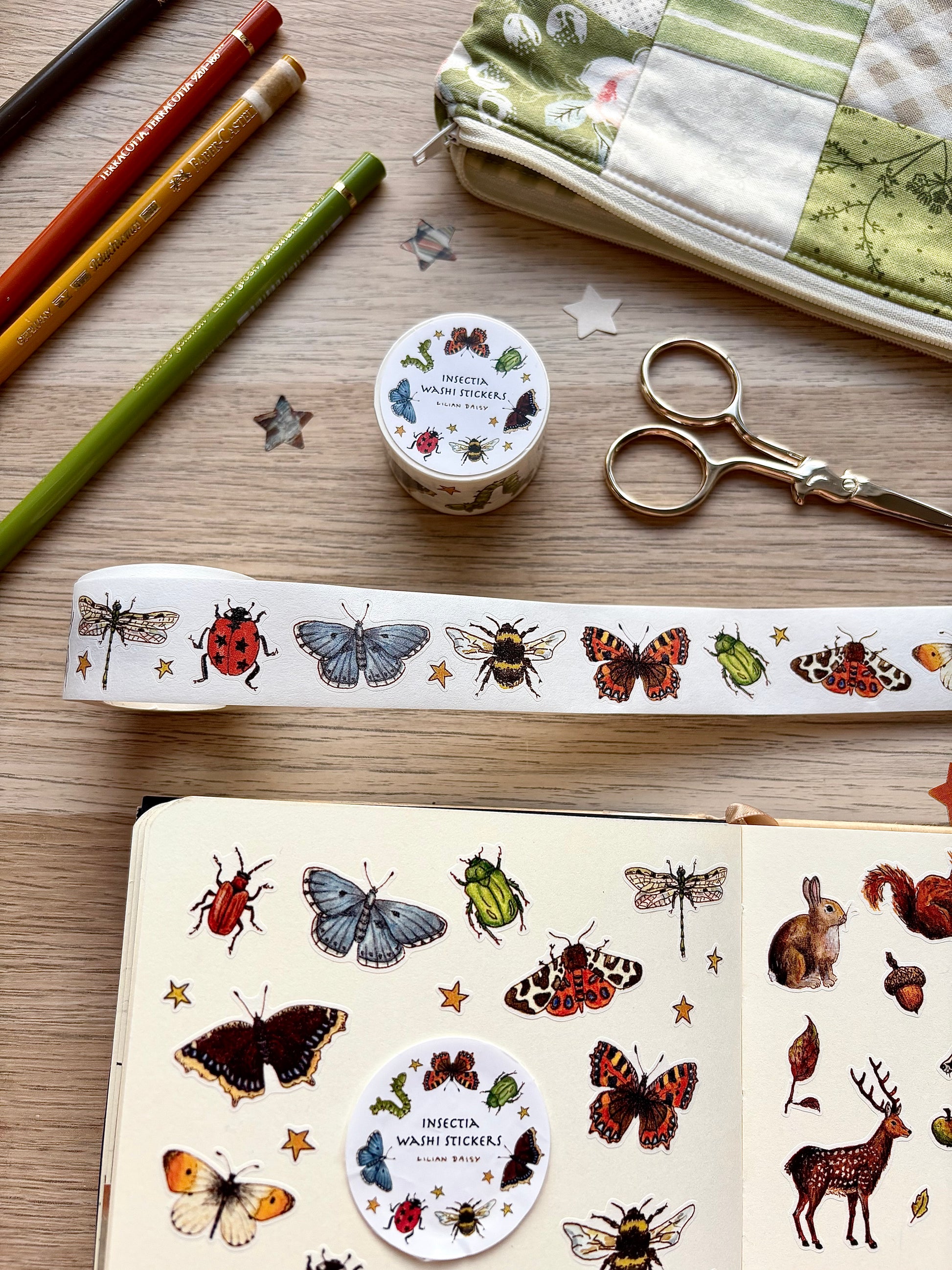 Die-cut washi stickers featuring hand-painted illustrations of butterflies, beetles, moths and various other insects.